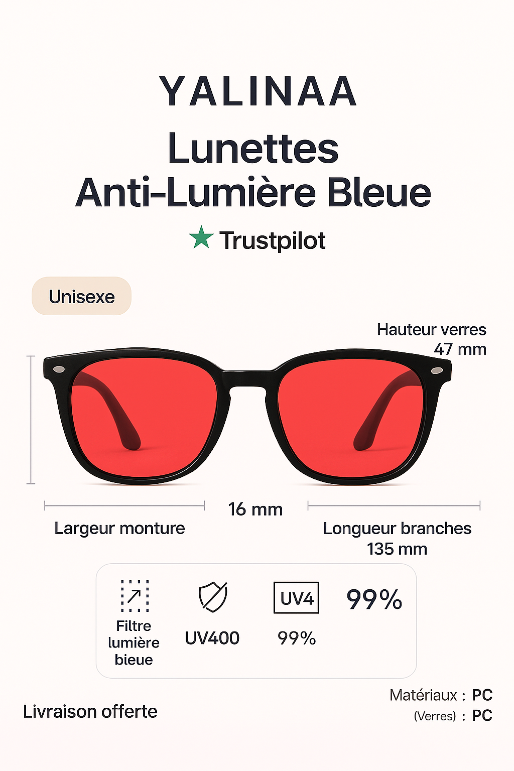 Nos verres UV400 bloquent ~100 % des UV (<400 nm) et filtrent sélectivement le bleu-violet (400–455 nm), tout en laissant passer le bleu-turquoise (460–500 nm) utile à la vision et aux rythmes biologiques. Résultat : moins d’éblouissement, moins de fatigue oculaire, couleurs nettes.